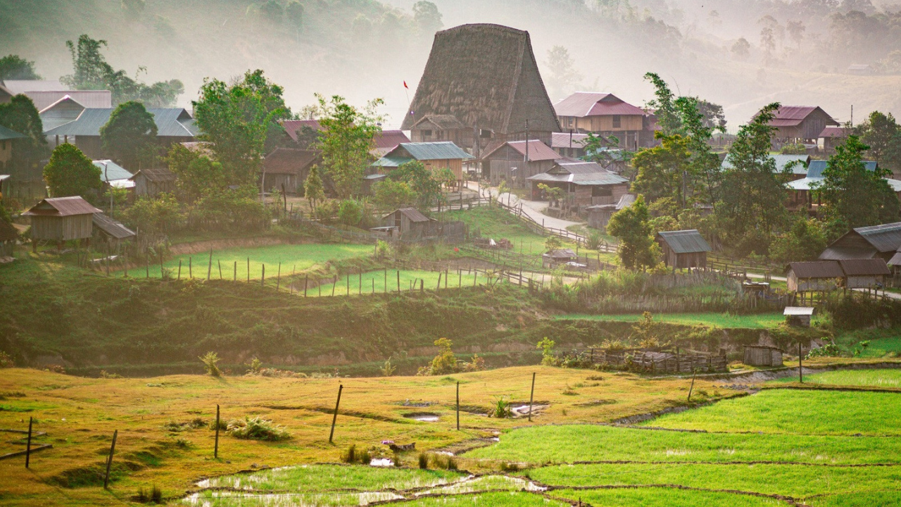 Sáng sớm, tôi dậy thật sớm, chạy xe lên đỉnh Ngọc Ruông để ngắm toàn cảnh làng. Mây luồn qua thung, trôi bồng bềnh, cả Vi Rơ Ngheo như đang ngủ trong tấm chăn trắng mỏng tang.