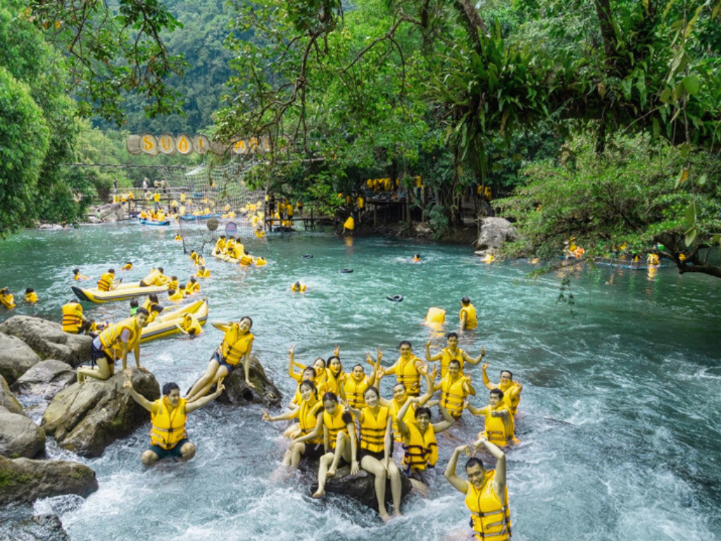 Dòng nước xanh ngọc của Sông Chày và bóng rậm Karst Phong Nha – Kẻ Bàng tạo nên một “sân chơi thiên nhiên” hiếm có: vừa phóng khoáng, vừa an toàn. Hãy bắt đầu bằng cú treo mình trên zipline băng qua mặt sông lấp lánh nắng—cảm giác gió rít bên tai, cảnh núi rừng mở ra ngay dưới chân đủ khiến tim bạn đập nhanh hơn… rồi “ùm!” chạm nước mát lạnh, bật cười như trẻ nhỏ. Từ đây, chèo kayak thong dong giữa hai bờ đá vôi rêu phủ, ghé Hang Tối và bật đèn đội đầu: bóng tối ôm trọn, giọt nước tí tách, thạch nhũ lấp lánh mở lối cho cuộc phiêu lưu nhỏ. Điểm “đỉnh” nhất là tắm bùn trong lòng hang: lớp bùn khoáng mịn như nhung, nâng người bạn nổi bồng bềnh—một liệu trình “spa tự nhiên” đúng nghĩa. Ra ngoài, tiếp nối với trò đu dây, nhảy tháp, cầu gỗ thăng bằng, hay đơn giản là thả mình trên phao giữa vệt nắng chiều. Khu vực được tổ chức an toan, chu đáo: áo phao – mũ bảo hộ – hướng dẫn viên chuyên nghiệp, phù hợp cả nhóm bạn thích “chill mạo hiểm” lẫn gia đình có trẻ em. Sông Chày – Hang Tối không chỉ là check-in; đó là combo cảm xúc: hồi hộp trên không, thư thái dưới nước, tò mò trong hang, và sảng khoái sau bùn khoáng. Nếu bạn muốn một ngày vừa “đã” thể lực, vừa “đủ” ảnh đẹp và “đầy” kỷ niệm, hãy chọn Sông Chày – Hang Tối: nơi thiên nhiên làm đạo diễn, còn bạn là nhân vật chính của bộ phim mùa hè của chính mình.
