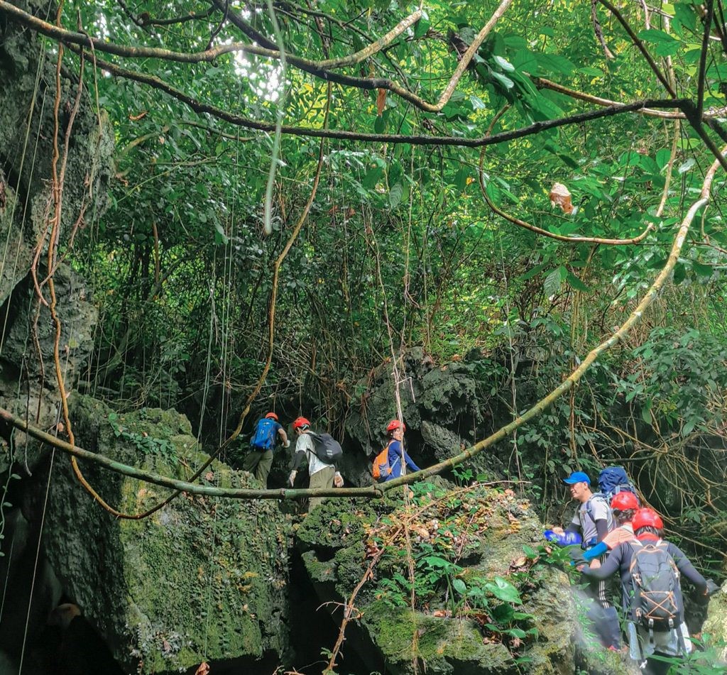 Không phải đi rừng xong rồi lên xe đi hang. Ở đây, cảnh quan nối nhau như một đường dây: băng rừng → chạm suối → bước thẳng vào hang nước. Hành trình có nhịp tự nhiên, không bị “cắt đoạn” kiểu tour tham quan thông thường.