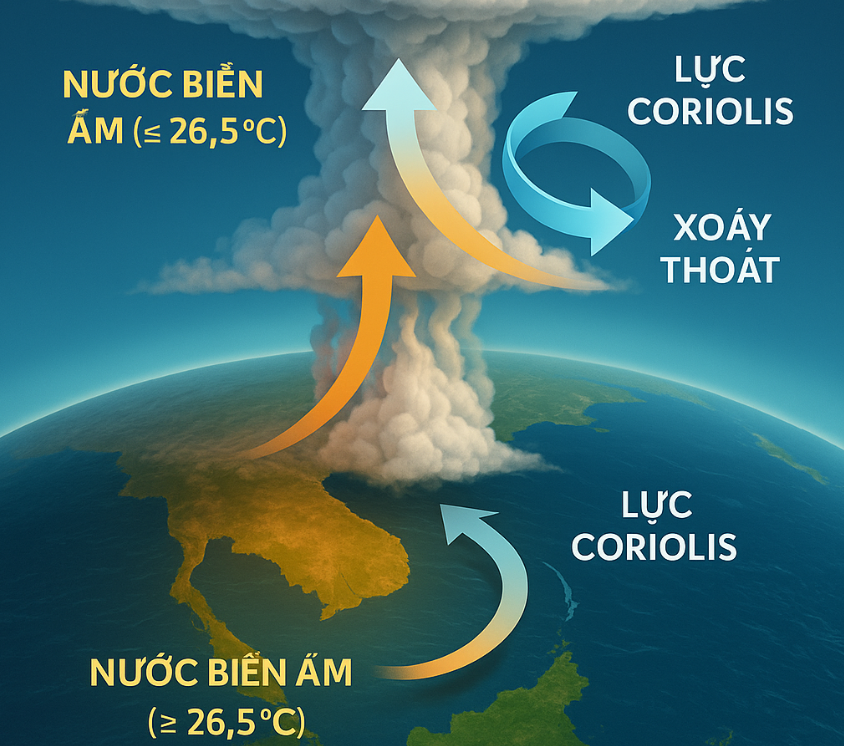 Một yếu tố đặc biệt quan trọng trong sự hình thành bão nhiệt đới là lực Coriolis – hệ quả từ sự quay của Trái Đất. Lực Coriolis làm lệch hướng chuyển động của không khí: ở bán cầu Bắc, không khí xoay theo hướng ngược chiều kim đồng hồ quanh vùng thấp; còn ở bán cầu Nam, không khí xoay theo chiều kim đồng hồ. Hiệu ứng này giúp cho khối không khí ẩm đang bốc lên bắt đầu xoay tròn, tạo ra cấu trúc hoàn lưu xoắn ốc đặc trưng của bão. Chính vì cần lực Coriolis để tạo độ xoáy, bão không thể hình thành ở vùng xích đạo – nơi hiệu ứng Coriolis gần như bằng 0. Trên thực tế, các cơn bão nhiệt đới thường chỉ bắt đầu hình thành ở các vĩ độ khoảng từ 5° trở lên về phía bắc hoặc nam so với xích đạo.. Điều này giải thích vì sao khu vực ngay quanh đường xích đạo hầu như không bao giờ có bão, còn các vùng hơi xa xích đạo một chút lại là “cái nôi” cho nhiều cơn bão dữ dội.