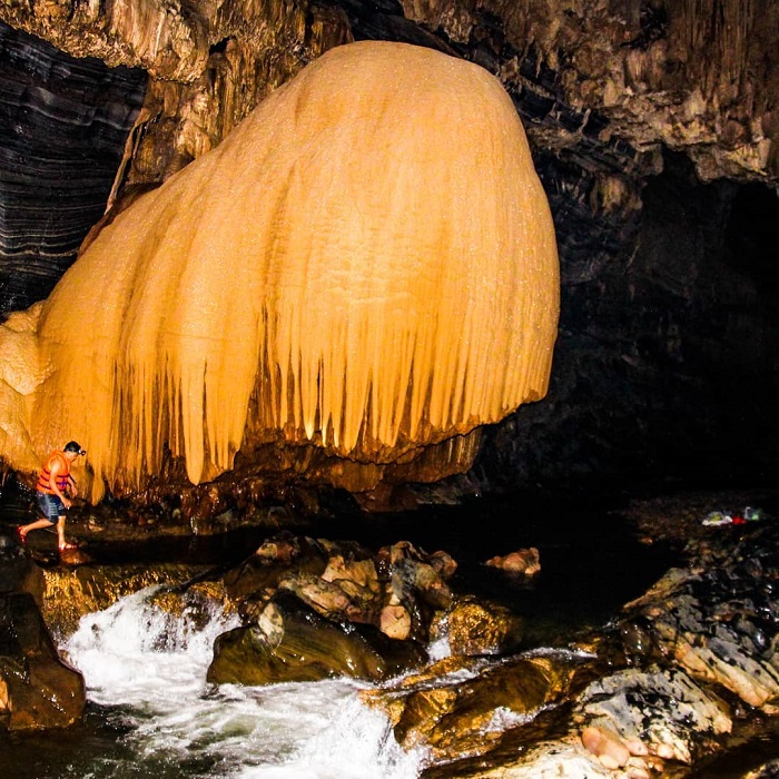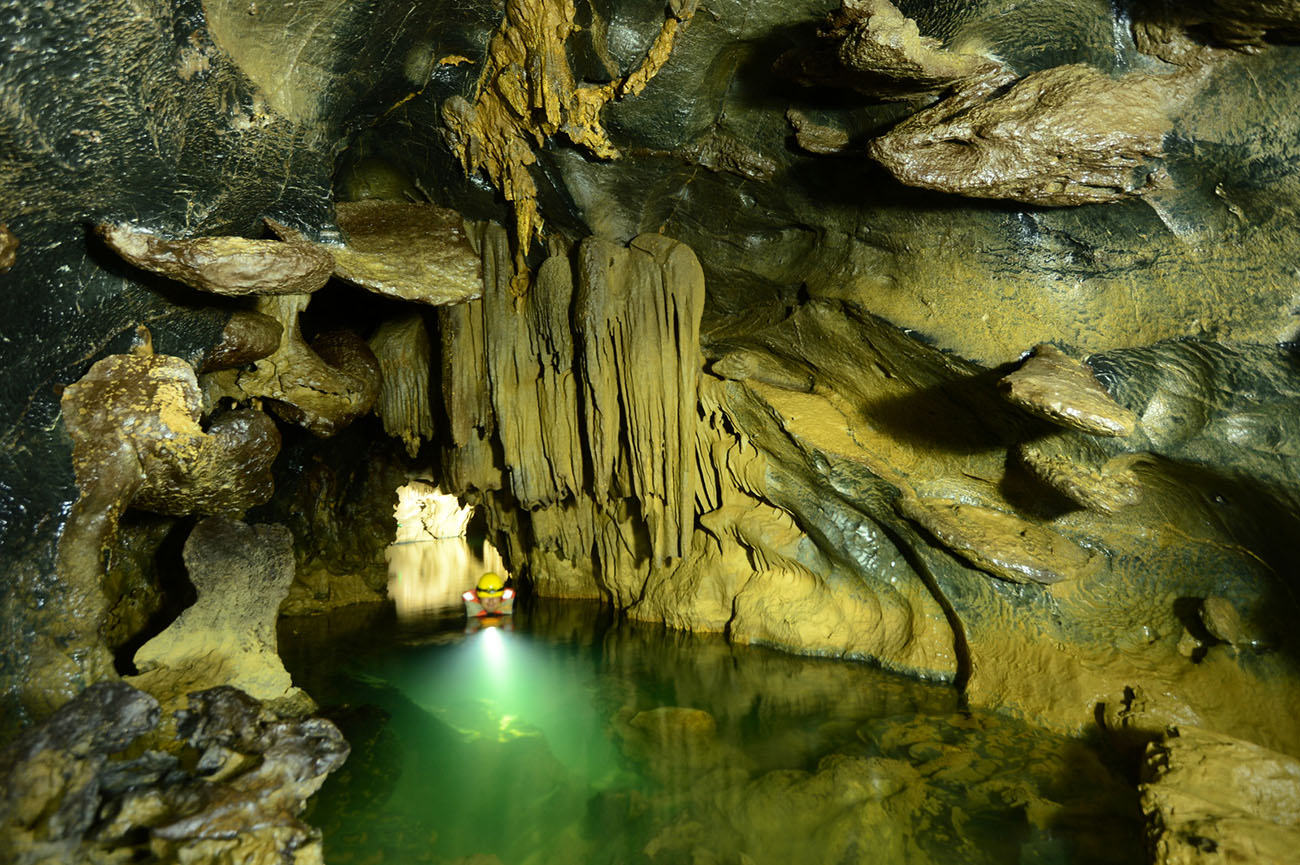 Từ hang khô, du khách tiếp tục xuống thang để đến bến kayak. Nếu yêu thích mạo hiểm, bạn có thể nhảy từ độ cao 5m xuống dòng sông ngầm mát lạnh. Sau đó, du khách được hướng dẫn kỹ năng chèo kayak và khám phá gần 1km sông ngầm huyền bí bên trong hang.